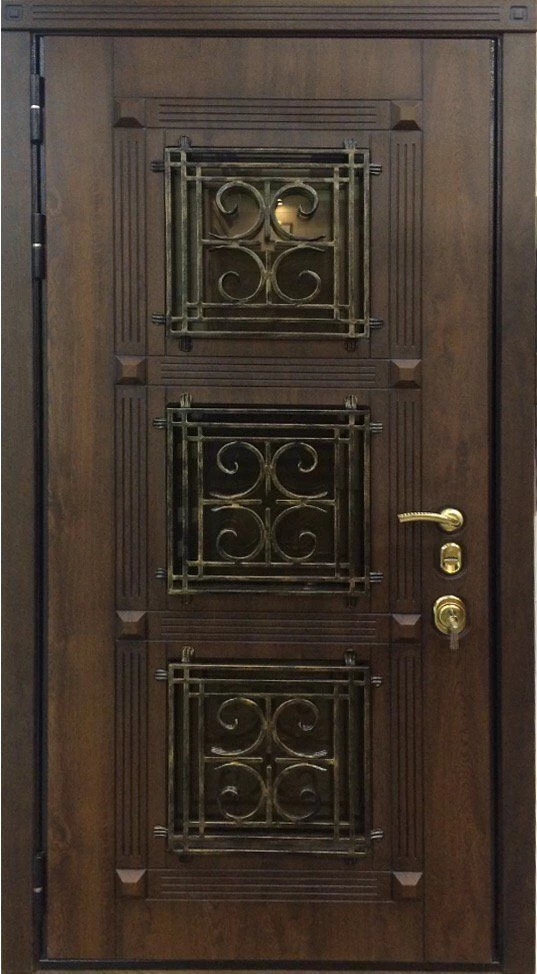 Металлическую дверь из корабельной фанеры можно декорировать ковкой и стеклом, витражом, зеркальными вставками. При установки такой двери в коттедж, стоит рассмотреть вариант изготовления двери с терморазрывом. Это позволит не делать в доме холодный тамбур, но при этом сохранить в доме тепло.
